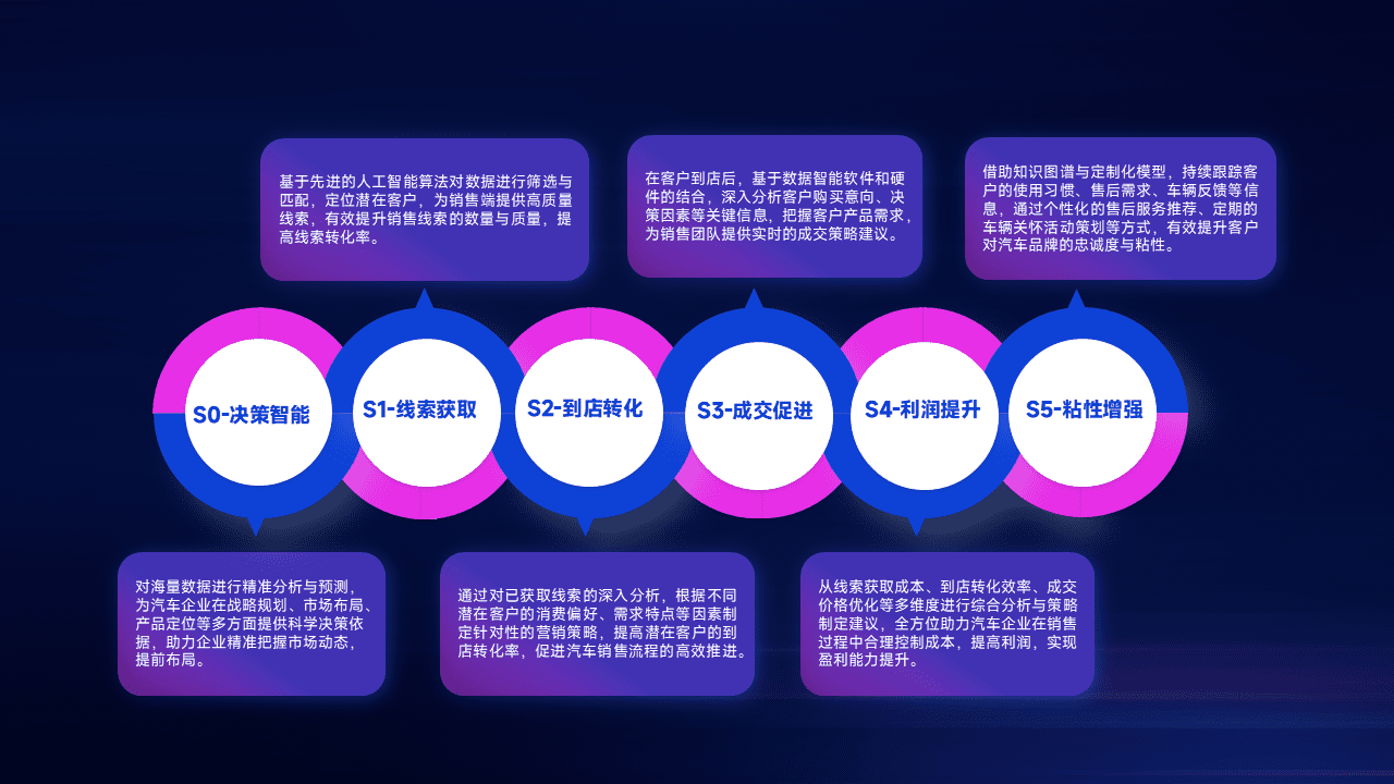 基于销售转化漏斗的薄弱环节,,,为客户提供数据+模型+运营的智能应用,,实现销售业绩的提升;推动线索管理全链路的精细化管理和运营。。。。